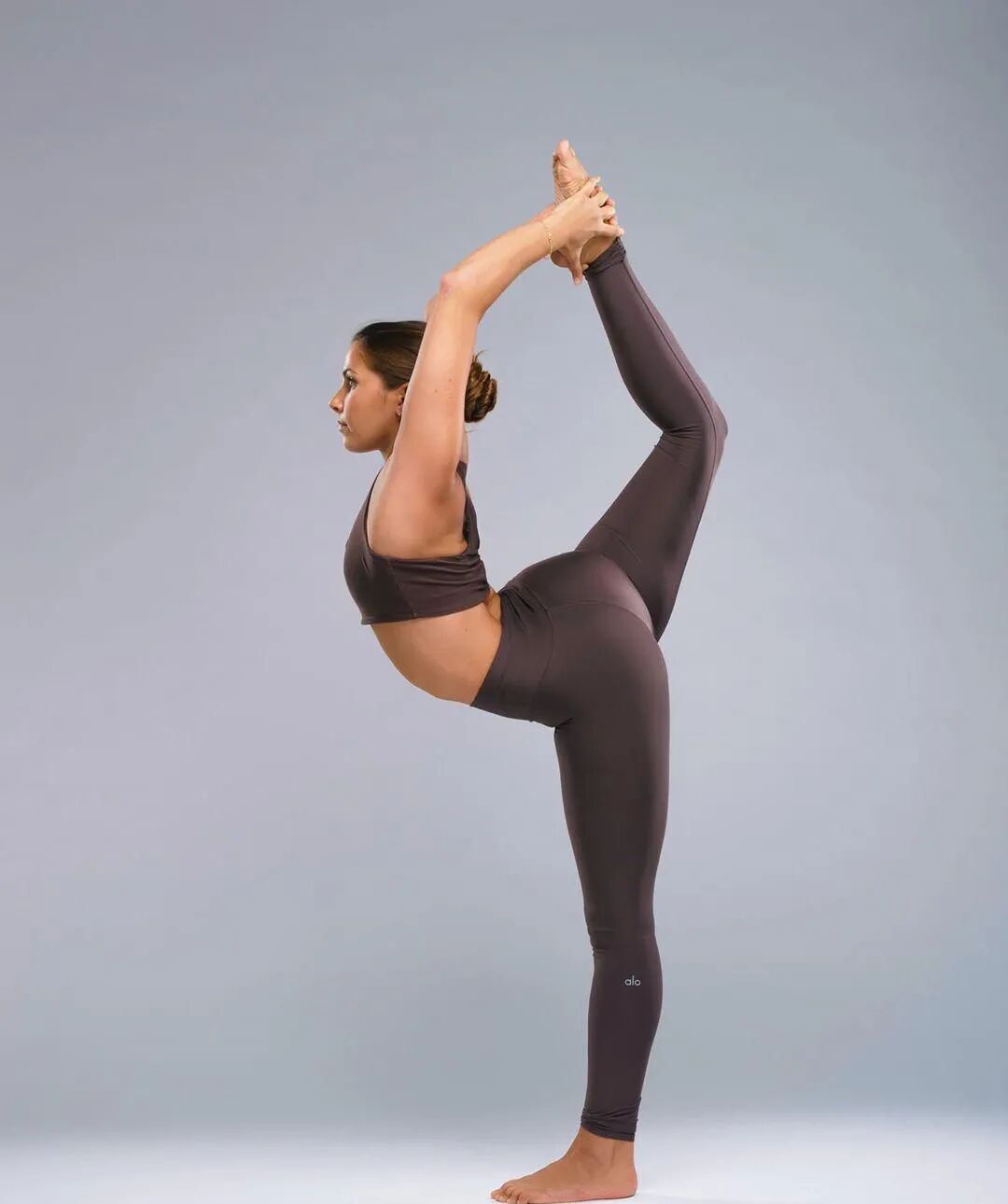 单腿平衡式变式,首先是自然的盘腿坐在地上,然后挺直自己的上半身,打开右腿向上伸直,伸出左手绕过脑袋后方抓住右脚脚踝,右手伸直支撑在地上。