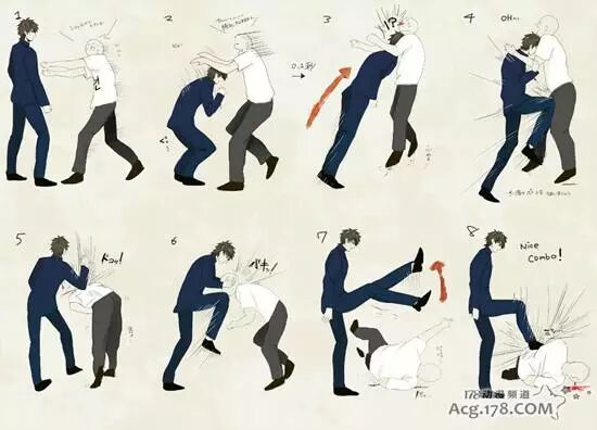 从上面的一系列图片上,可以看到当遇到此类情况,可以主动近身用头部撞击对方下颚,之后膝关节攻击对方金蛋并用肘击将对方击倒在地,最后用脚后跟攻击对方肋部。其实,在之前我们就曾为大家介绍过由「龙珠」作者鸟山明老师为读者创作的防身术漫画,里面除了这一招之外也还有削耳神功等技巧