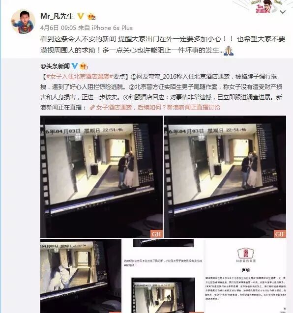 近日,一段名为“北京望京798和颐酒店女生遇袭”的视频引发大量关注。根据上传者称,自己在望京798和颐酒店住店时,被一陌生男子强行拖拽,差一点被强行带走。后被酒店酒店工作人员和另外一名女房客阻止,而且酒店保安未出现。
