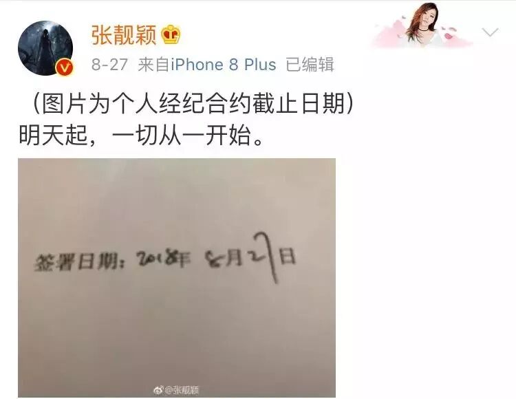 张靓颖在微博晒出个人经纪合约到期的截图,