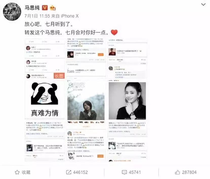 马思纯本人截取了一部分网友的言论发微博说:“放心吧,七月听到了,转发这个马思纯,七月会对你好一点。”