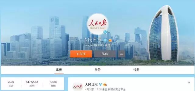 人民日报新浪微博粉丝5173万,各微博平台总粉丝量超过9000万,是中国第一媒体微博;人民日报官方微信公众号粉丝超过1000万,几乎篇篇十万+,长期雄踞各大微信公号排行榜榜首;人民日报客户端的累计自主下载量已突破1.6亿;人民日报还有侠客岛、人民网等一批影响力颇大的新媒体账号……