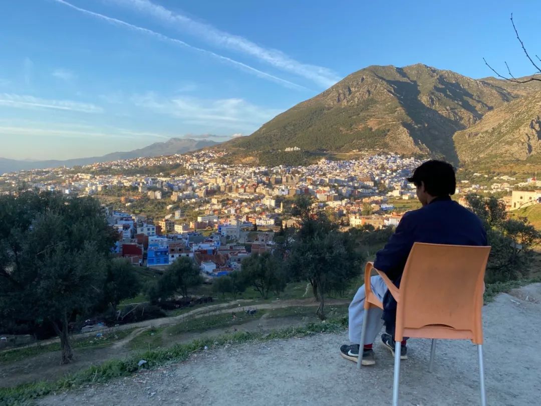 在摩洛哥另一座老城——舍夫沙万,杨玏也爬上过一座小山。