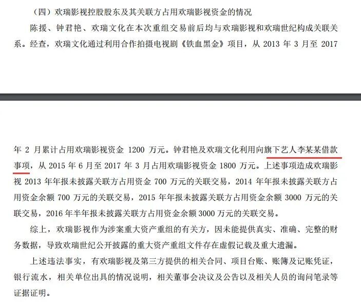 其中明星李易峰也牵扯其中。处罚决定书显示,在重大资产重组中,时任欢瑞影视董事长陈援、时任欢瑞影视董事、总经理钟君艳、欢瑞文化在重组交易前后均与欢瑞影视和欢瑞世纪构成关联关系。
