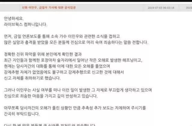 而李玟雨的经纪公司LIVEWORKS COMPANY在随后也对李玟雨性骚扰一事,发布了公开声明。