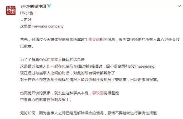 这次事件李玟雨公司的公关是很快的,基本嫌疑报道发出来没几个小时就迅速回应并且联系报案人撤案。
