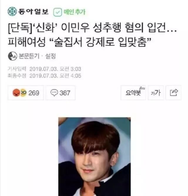 据韩国媒体7月3日凌晨3点爆料称:韩国知名偶像男团“神话”组合成员李玟雨涉嫌在酒席上对两名女性进行了性骚扰,据说警方目前已经开始了立案调查。