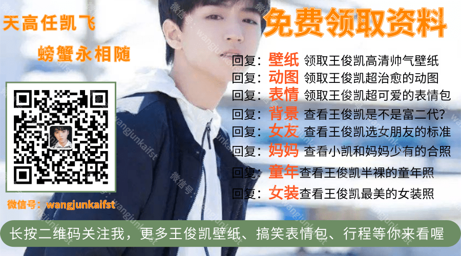 想知道王俊凯是不是富二代么?想知道王俊凯选女朋友的标准么?想看王俊凯的女装照么?长按上面图片二维码关注回复对应关键词,你都会知道的!