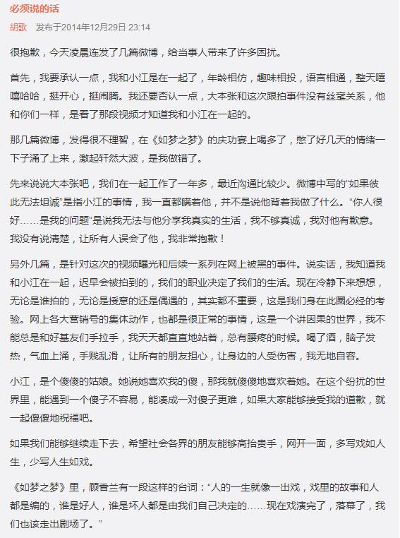 ▲去年12月,胡歌发文承认恋情