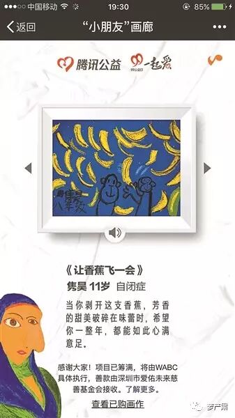腾讯公益展出自闭症儿童的画作,用一块钱就能买下画作电子版当屏保,而那些买画的钱都会再用于关爱自闭症儿童。