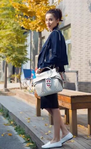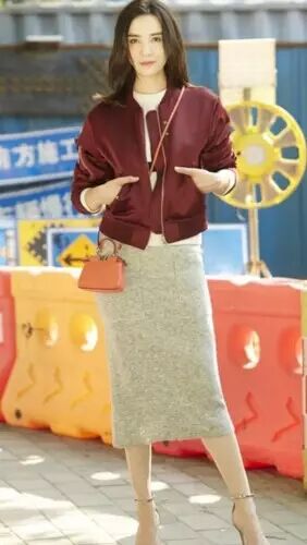 宋佳用酒红色的夹克+白色T恤+灰色一步裙+高跟鞋,简单的配色,看起来十分舒服,又优雅~