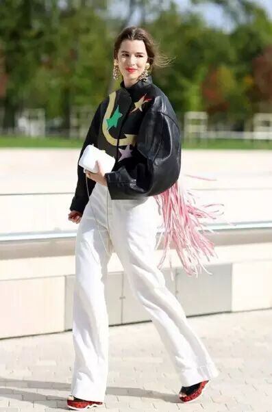 还有用皮夹克搭配阔腿裤+运动鞋的装扮,也是潮范十足,想要用夹克搭配出不一样的feel,你也可以自由发挥啊!