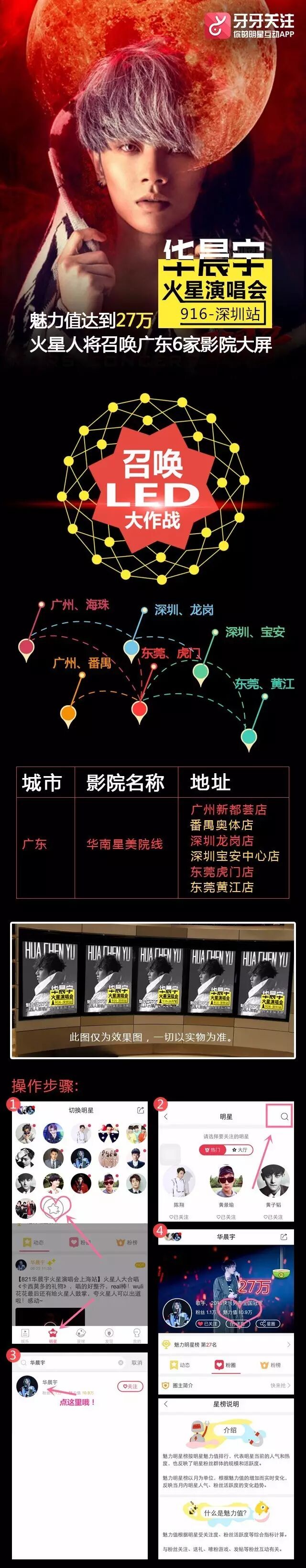 你想召唤广东6家电影院线投放大屏广告位给他应援吗?打开「牙牙关注APP」,当华晨宇粉圈魅力值到达27万即可实现!