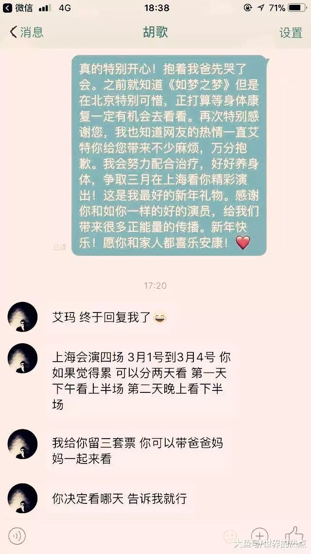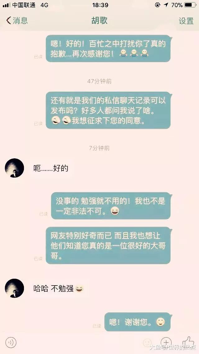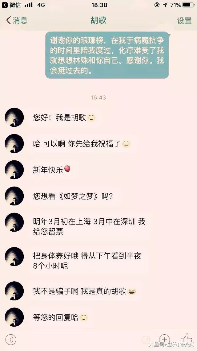这是一个患上了白血病的小姑娘。在住院期间是胡歌的忠实粉丝。一直看着胡歌的《琅玡榜》。她曾发消息给胡歌。谢谢你的《琅玡榜》,在我与病魔抗争的时间里陪我度过,化疗难受了我就想想林殊和你自己。感谢你,我会挺过去的。但是估计她自己也没有想到,机缘巧合之下,胡歌知道了这个小姑娘的事情之后主动联系了对方。只不过胡歌说话的方式还是很好玩啊。也挺尊重粉丝的,开口都是您啊。