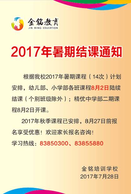 根据我校2017年暑期课程(14次)计划安排,幼儿部、小学部各班课程8月2日陆续结课(个别班级除外),精优中学部语、数、英二期课程8月2日(周三)开课啦!有报名的学员不要忘记上课时间咯!