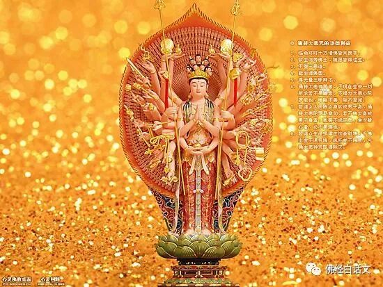 假如我在未来堪能利益安乐一切众生,令我即时身生千手千眼具足。发了这个誓愿后,当时身上就千手千眼全部具足了,十方大地有六种震动。十方的千佛全都放出光明照触在我的身上,并照耀十方的无边世界。
