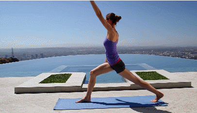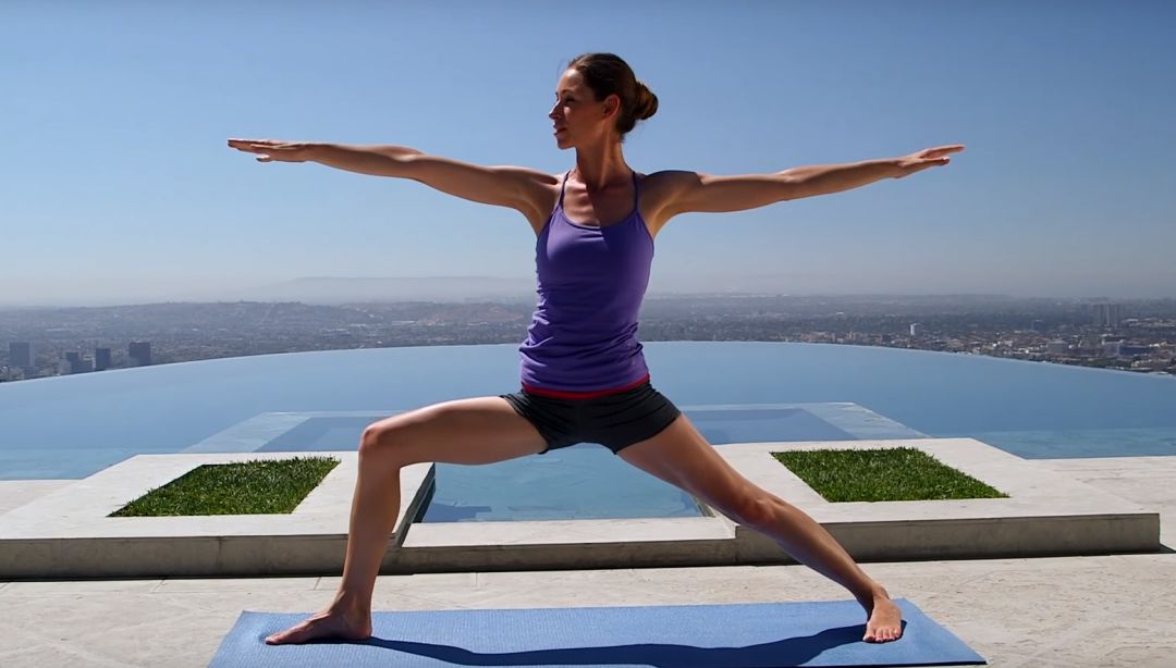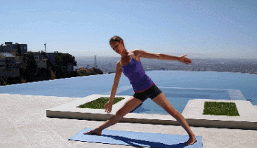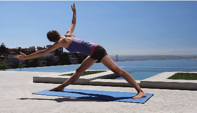 保持箭步蹲的姿势,双臂平举舒展呈一字,身体转向一侧,呈战士二式,然后回到中心位置,再转向另一侧。