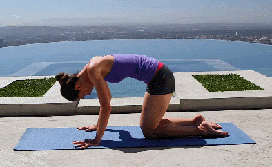 跪在瑜伽垫上,腰部塌下、头部扬起呈猫式,再慢慢拱起背、颔首,重复几次。