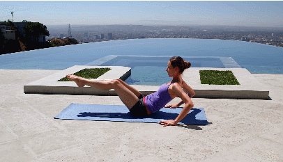 坐在瑜伽垫上,用腰腹力量抬举双腿呈V字式,注意上身挺立,不要躺下去,否则腿抬起不来。