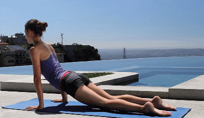 趴在瑜伽垫上,撑起上身直到大腿也离开地面,缓慢扭转腰部。