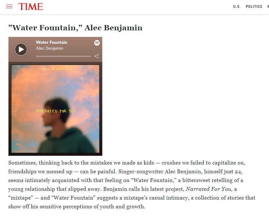 这个月Alec发行了他的新mixtape《Narrated for You》,不仅被多个乐评网站称赞,连TIME时代杂志都推荐其中的主打歌“Water Fountain”为当周必听歌曲。