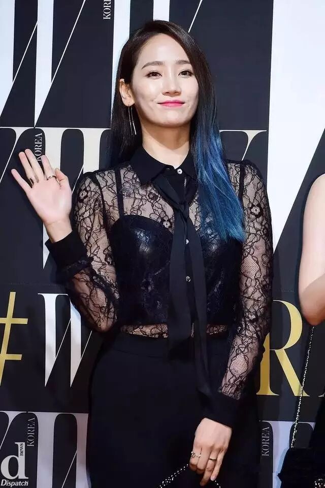 ▲誉恩黑色蕾丝衬衫领,系细围巾,搭长长的线形耳饰,发梢染成孔雀蓝,每个细节都很潮。黑色小裙子和上面的透明形成对比,也给性感加分。