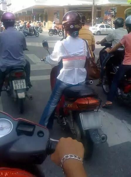 ▼需要注意的是,外穿的bra一定要挑有设计感的。像下面这个妹纸真把粉色的bra穿白衬衫外面,后面骑摩托的哥们就很尴尬了。