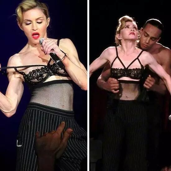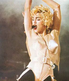 ▼九十年代,麦当娜和内衣外穿画上等号。在世界巡演中,黑色的透视装+内衣外穿上阵,舞台上挑逗肌肉男上演致命诱惑。