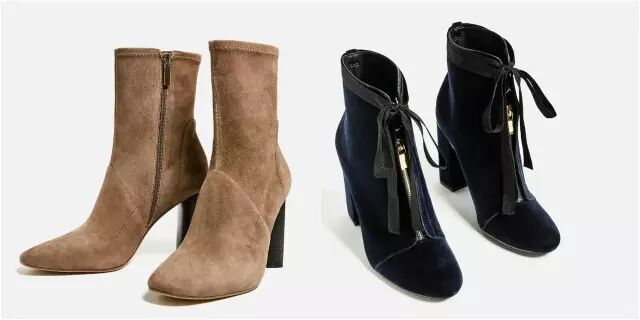 zara新款水磨皮靴和天鹅绒短靴,粗跟设计,适合搭配短裙、短裤或者长款T恤。参考价格:¥799,¥459
