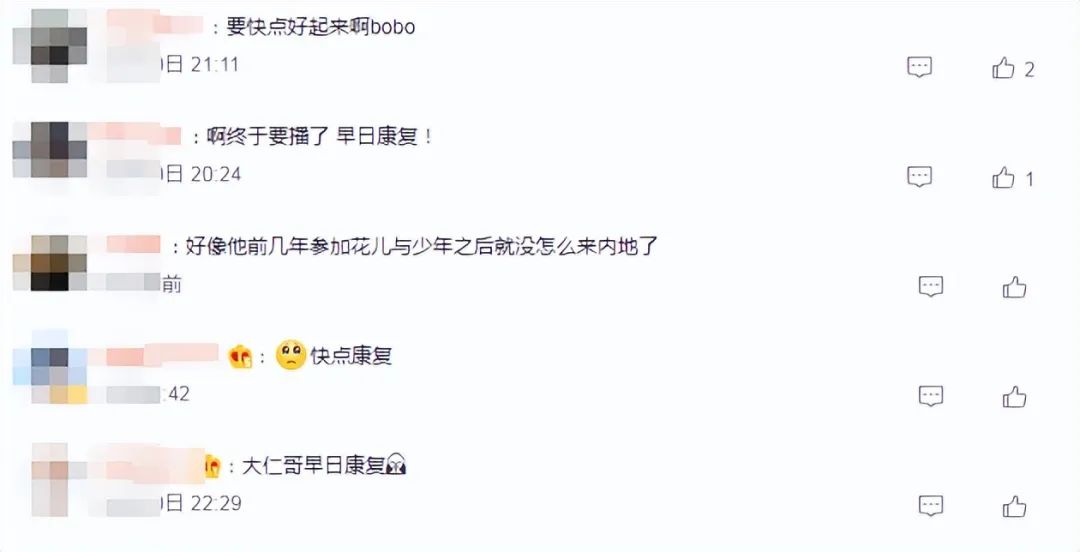 网友们也是纷纷表示遗憾,希望他能早日康复,有人说:要快点好起来啊!也有人说:啊终于要播了,早日康复!甚至还有人说:大仁哥早日康复.