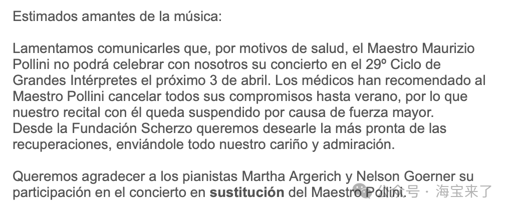 作为一代大师,他的录音和现场启蒙了无数年轻人(包括我)。之前购买了他原定于4月3日在马德里的独奏会,后收到邮件,说大师身体不适取消了演出,换成Nelson Goerner (尼尔森·戈纳)和阿格里奇的双钢琴演出。当时还在开玩笑说,哪有让年纪大的来帮年纪小的代打的,没想到居然就这样又和一位二十世纪的顶尖大师擦肩而过了。