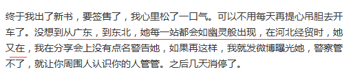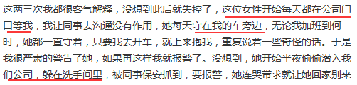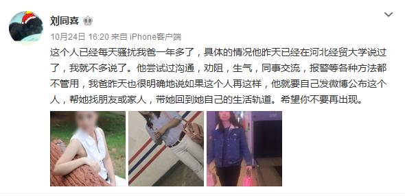 刘同在文中表示,“有件事情持续一年了。今天又发生了,我决定写出来。”文中详述了这个 女生一年多对自己的跟踪骚扰,各类签售会上的发言和表明,刘同表示“不堪其扰”,希望 家人可以把她救回去,并且用小号发了她的马赛克的照片,以示警告。