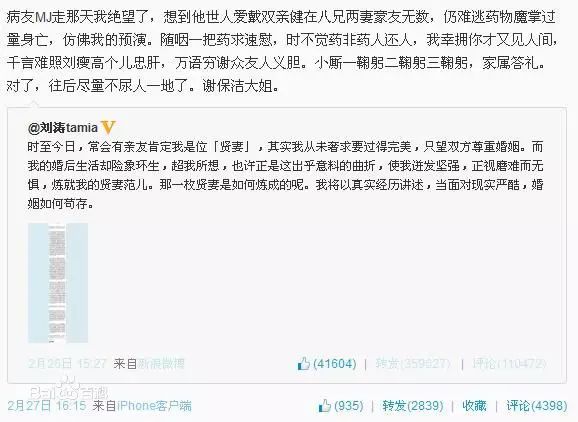 直到2013年,刘涛发了一篇长微博,告诉所有人她是怎么挺过来的。微博中她首次描述自己的“豪门婚姻”。
