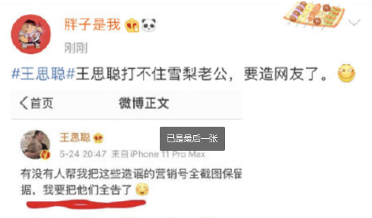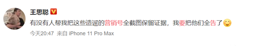王思聪和前女友的老公发生冲突,这件事曝光后绝对是会上热搜的,消息出来之后,王思聪说:有没有人帮我把这些造谣的营销号全截图保留证据,我要把他们全告了,同时还配上了一个可爱的表情,看来王思聪是在否认与雪梨老公起冲突这件事情。