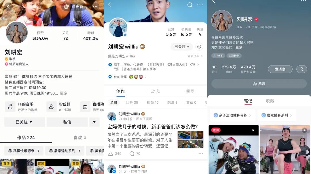 刘畊宏虽然在小红书、知乎、微博、B站等多个平台都运营有账号,但由于直播健身这项活动主要集中在抖音,而其他平台更多只是发布一些短视频,因此,绝大部分流量实际都被导流进了抖音。