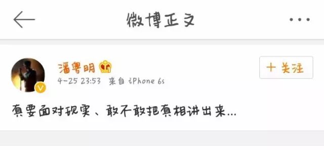 各有自个的说辞,董洁在节目上说要接受现实,但是潘粤明当即发了微博说面对现实,敢不敢把真相讲出来。