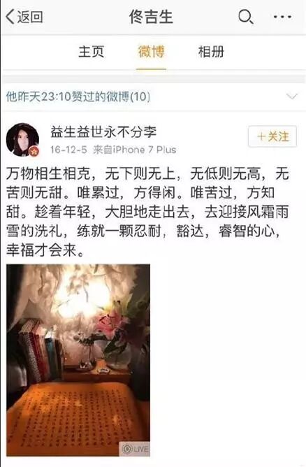 佟爸爸在陈思成出轨不久,女儿心烦意乱,正处于舆论风口时,他在微博上点赞了一条文字,文字大概意思是“练就一颗忍耐,豁达,睿智的心,幸福才会来。”