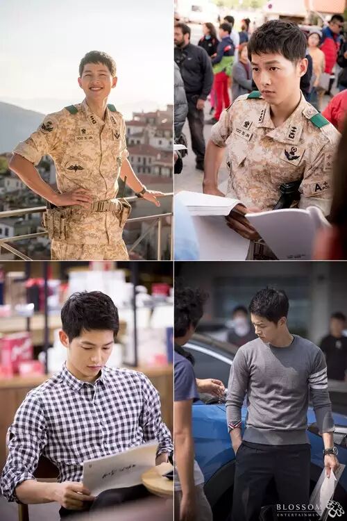 韩国演员宋仲基拍摄电视剧《太阳的后裔》幕后花絮照曝光,比太阳还耀眼的魅力紧紧抓住现场工作人员的心。