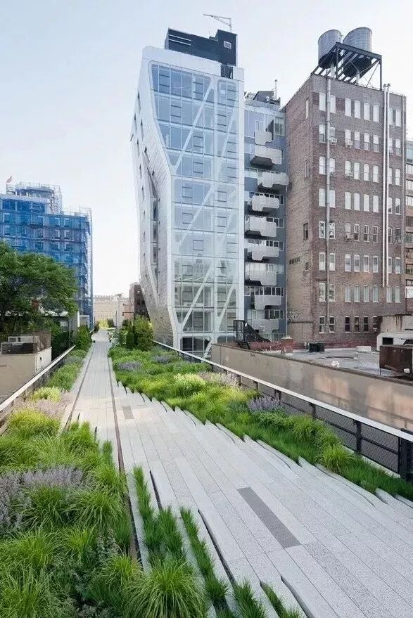 一座建于20世纪30年代的长达1.4英里的高架铁路线将被拆除,但被挽救成为世界上最着名的线性公园之一,也是全世界再利用基础设施项目的典范。 南端是伦佐·皮亚诺设计的惠特尼博物馆; 北端围绕着哈德森广场。如今房价飙升,毗邻公园的一套公寓均价约为600万美元。沿高线公园的新建筑设计者有: Frank Gehry; ZahaHadid; Jean Nouvel; Ennead; Renzo Piano; Shigeru Ban; Rafael Viñoly; BIG - BjarkeIngels Group; Robert A.M. Stern; Neil Denari; Studio Gang; 等等。