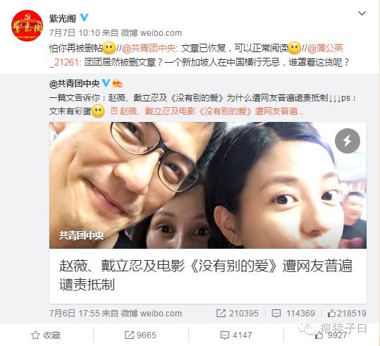 就在这个时候,团中央看这么热闹,就发了一个微博,说什么媒体被境外势力控制,就是亡国的先兆?再发一个网友为什么抵制赵军旗电影的由来,结果被赵军旗背后的势力操控下删除:你团中央算什么东西,老子连dang中央的微博都删。这下dang真的被吓了一跳?尼玛,什么时候自己都被专制了?dang中央微博紫光阁发了个意味深长的微博:求你不要在删我的帖子了,欺负新人么?又跑到团中央的微博里支持一下:怕你再被删。