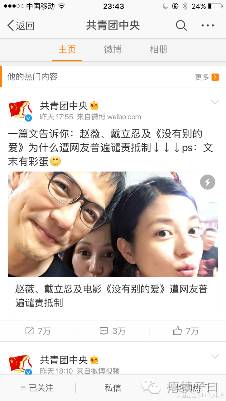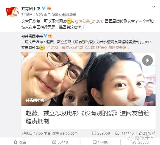 由于网友热议,党媒“共青团中央”于7月6日发布长微博“赵薇、戴立忍及电影《没有别的爱》遭网友普遍谴责抵制”一文,文中详述网友在天涯论坛发帖后被秒删帖事件以及戴立忍、水原希子等人的过往言行。