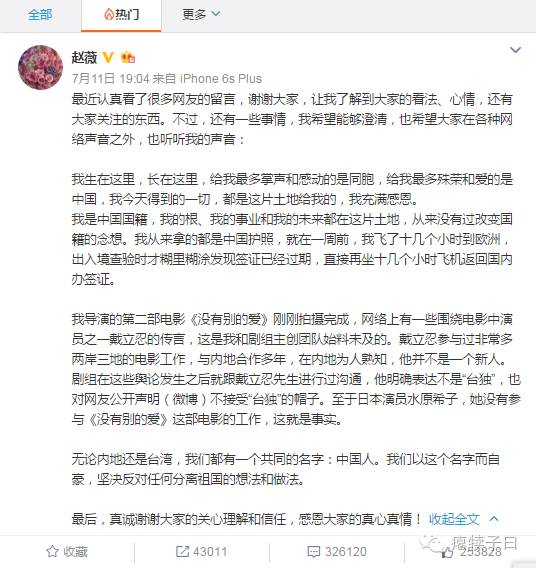 赵薇澄清“辱华”风波:我是中国人 坚决反对分裂