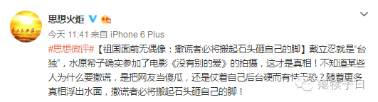 有着国家文化安全与意识形态建设研究中心蓝V认证的官微对此发文置评,评论如下:“【祖国面前无偶像:撒谎者必将搬起石头砸自己的脚】戴立忍就是“台独”,水原希子确实参加了电影《没有别的爱》的拍摄,这才是真相!不知道某些人为什么要撒谎,是把网友当傻瓜,还是仗着自己后台硬而有恃无恐?随着更多真相浮出水面,撒谎者必将搬起石头砸自己的脚!”,原图如下: