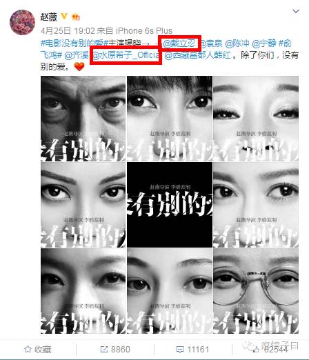 事件始末是,赵薇拍了个新电影叫《没有别的爱》,并在2016年4月25日于其个人微博发布了主要演员名单。如图: