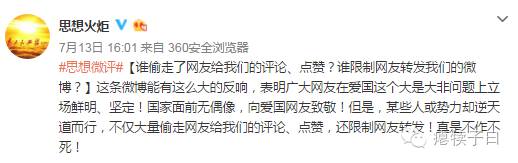 除此之外,官微“思想火炬”还发博文声称“【谁偷走了网友给我们的评论、点赞?谁限制网友转发我们的微博?】这条微博能有这么大的反响,表明广大网友在爱国这个大是大非问题上立场鲜明、坚定!国家面前无偶像,向爱国网友致敬!但是,某些人或势力却逆天道而行,不仅大量偷走网友给我们的评论、点赞,还限制网友转发!真是不作不死!”