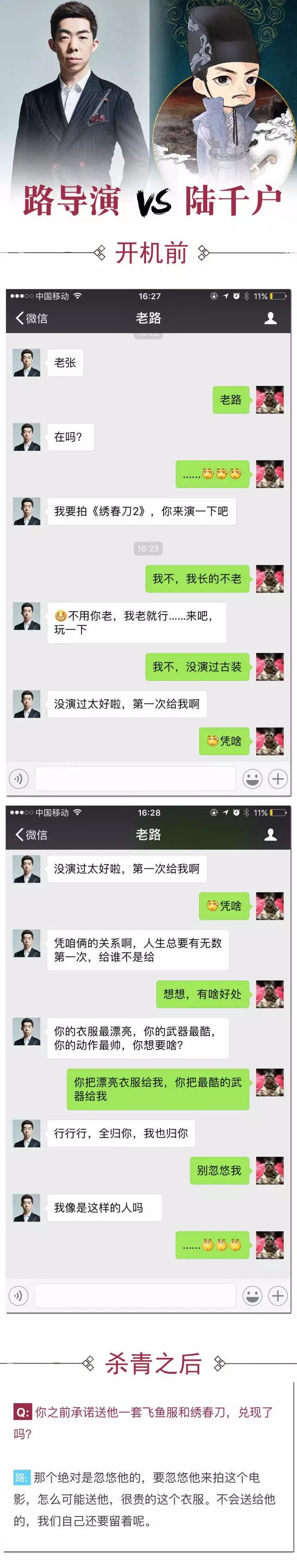 所以聊完了,在我心里就是完了,哪怕震哥真的很帅,哪怕他们的《绣春刀I》拍得真的很好。回去之后,我的脑海里出现了他们俩的形象:俩身子,一张脸。我的焦虑症就犯了,赶紧在手机上标记了他们的姓名和职务:“路阳·长得像制片人张宁的导演”、“张宁·长得像路阳导演的制片人”。
