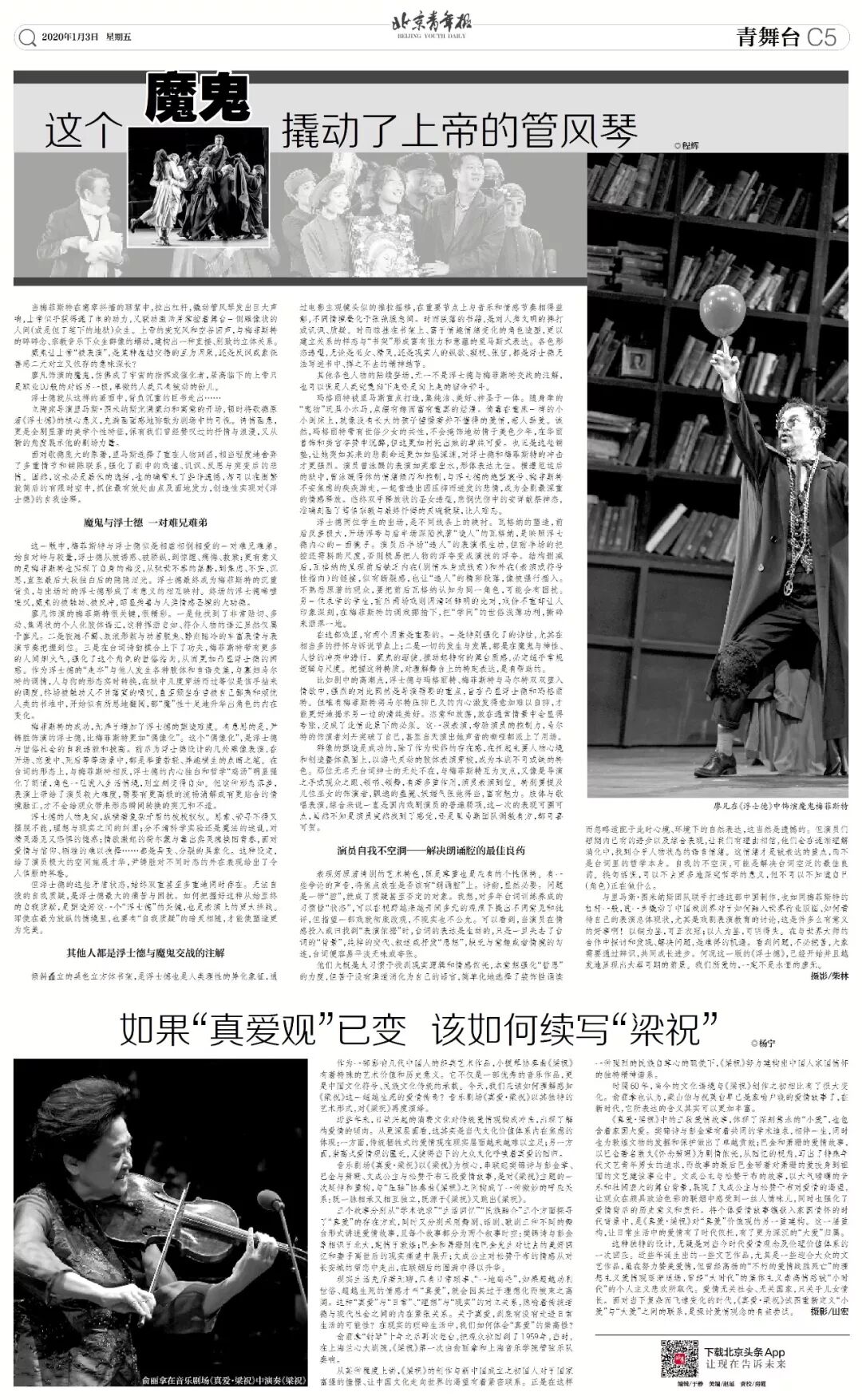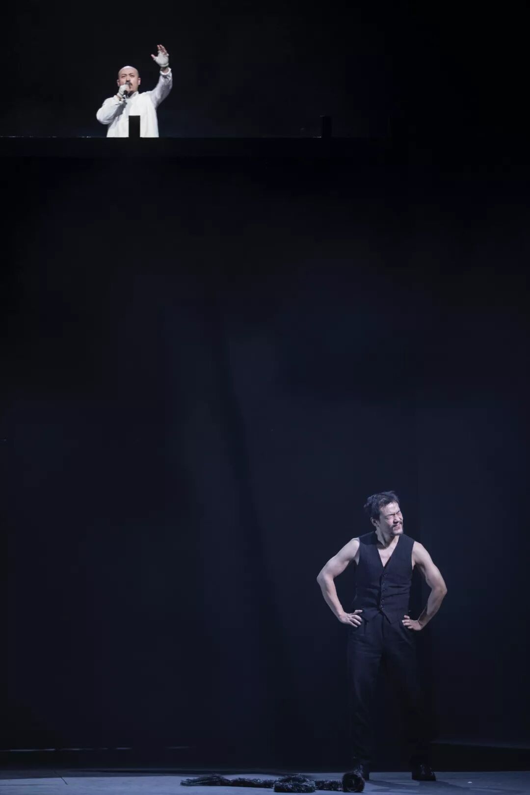 廖凡这个魔鬼 北青艺评 内地男星 2020-01-03 12:00:10 1135 创作不易,用心坚持,欢迎请BaGua喝几杯爱心咖啡!打赏并支持本文 打赏并删除本文 当梅菲斯特在窸窣抖搐的聒絮中,拉出杠杆,撬动管风琴发出巨大声响,上帝似乎获得通了电的动力,又联动激活并掌控着舞台一侧雕像状的人间(或是但丁笔下的地狱)众生。上帝的麦克风和空谷回声,与梅菲斯特的碎碎念、宗教音乐下众生群像的蠕动,建构出一种直接、别致的立体关系。魔鬼让上帝“被表演”,是某种盘结交错的互为因果,还是反讽或象征善恶二元对立又依存的意味深长?廖凡饰演的魔鬼,仿佛成了宇宙的指挥或催化者,居高临下的上帝只是职业DJ般的对话另一极,卑微的人类只有被动的份儿。浮士德就从这样的画面中,背负沉重的巨书走出……立陶宛导演里马斯·图米纳斯充满魔幻和寓意的开场,顿时将歌德原著《浮士德》的核心意义,充满画面感地弥散为剧场中的可视。诗情画意,更是全剧显著的美学个性特征,保有我们曾经赞叹过的抒情与浪漫,又从新的角度展示他的剧场力量。面对歌德庞大的原著,里马斯选择了重在人物刻画,相当程度地舍弃了多重情节和铺陈联系,强化了剧中的戏谑、讥讽、反思与突变后的悲情。固然,这未必是最佳的选择,也的确带来了些许遗憾,却可以在删繁就简后的有限时空中,抓住最有效处由点及面地发力,创造性实现对《浮士德》的自我诠释。魔鬼与浮士德 一对难兄难弟这一版中,梅菲斯特与浮士德似是相虐相悯相爱的一对难兄难弟。始自对峙与较量,浮士德从被诱惑、被骄纵,到惊醒、痛悔、救赎;更有意义的是梅菲斯特也实现了自身的幽变,从玩世不恭的桀骜,到焦虑、不安、沉思,直至最后大段独白后的隐隐泪光。浮士德最终成为梅菲斯特的沉重背负,与出场时的浮士德形成了有意义的相互映衬。终场的浮士德唏嘘嗟叹,魔鬼的被触动、被反冲,昭显美善与人类情感圣境的大功德。廖凡饰演的梅菲斯特很关键,很精彩。一是他找到了非常贴切、多动、焦渴状的个人化肢体语汇,这种挥洒自如、符合人物的语汇显然仅属于廖凡。二是狡黠不羁、放浪形骸与动若脱兔、静则酷冷的丰富表情与表演节奏把握到位。三是在台词诗韵糅合上下了功夫,梅菲斯特带有更多的人间烟火气,强化了这个角色的世俗指向,从而更加凸显浮士德的困惑。作为浮士德的“走卒”与他人发生各种肢体和言语交集,与寡妇马尔特的调情,人与狗的形态实时转换,在狱中几度穿场而过等似是信手拈来的调度,终场被触动又不甘落寞的喟叹,直至颓坐在曾被自己鄙夷和烦忧人类的书堆中,开始似有所思地翻阅,都“魔”性十足地升华出角色的内在变化。梅菲斯特的成功,无异增加了浮士德的塑造难度。有意思的是,尹铸胜饰演的浮士德,比梅菲斯特更加“偶像化”。这个“偶像化”,是浮士德与世俗社会的自我造就和拔高。前后为浮士德设计的几处雕像表演,在开场、恋爱中、死后等等场景中,都是举重若轻、逸趣横生的点睛之笔。在台词的形态上,与梅菲斯特相反,浮士德的内心独白和哲学“鸡汤”明显强化了朗诵,角色一旦进入生活情境,则立刻变得自如。但这种形态落差,表演上带给了演员较大难度,需要有更高级的流畅消解或有更贴合的情境融汇,才不会给观众带来形态瞬间转换的突兀和不适。浮士德的人物走向,纵横着复杂矛盾的枝枝杈杈。思索、苦寻不得又摆脱不能,理想与现实之间的纠困;分不清科学实验还是魔法的迷乱,对精灵渴见又恐惧的惶惑;情欲激起的荷尔蒙与靠出卖灵魂换回青春,面对爱情与信仰、牺牲的难以抉择……都是异变、分裂的具象化。这种设定,给了演员极大的空间施展才华,尹铸胜对不同时态的外在表现给出了令人信服的答卷。但浮士德的这些矛盾状态,始终双重甚至多重地同时存在。无法自拔的自我质疑,是浮士德最大的痛苦与困扰。如何把握好这种从始至终的自我质疑,是塑造好这一个“浮士德”的关键,也是表演上的更大挑战。即使在最为放纵的情境里,也要有“自我质疑”的暗灵相随,才能使塑造更为完美。 其他人都是浮士德与魔鬼交战的注解倾斜矗立的黑色立方体书架,是浮士德也是人类理性的异化象征,通过电影主观镜头似地推拉摇移,在重要节点上与音乐和情感节奏相得益彰,不同情境叠化于张弛缓急间。时而跌落的书籍,是对人类文明的摔打或讥讽、质疑。时而晾挂在书架上、富于情趣情绪变化的角色造型,更以建立关系的样态与“书架”形成富有张力和意蕴的里马斯式表达。各色形态造型,无论是巫女、精灵,还是现实人的纵欲、窥视、张狂,都是浮士德无法写进书中、挥之不去的精神结节。其他各色人物的陆续登场,无一不是浮士德与梅菲斯特交战的注解,也可以说是人类究竟向下走还是向上走的宿命苦斗。玛格丽特被里马斯重点打造,集纯洁、美好、神圣于一体。随身牵的“宠物”玩具小木马,点缀有趣而富有童真的烂漫。倚靠在童床一样的小小闺床上,就像没有长大的孩子憧憬着并不懂得的爱情,惹人垂爱。诚然,玛格丽特带有世俗少女的共性,不会掩饰地动情于美色少年,在华丽首饰和美言夸赞中沉醉,但这更加衬托出她的单纯可爱。也正是这些铺垫,让她突如其来的悲剧命运更加如坠深渊,对浮士德和梅菲斯特的冲击才更强烈。年轻演员曾泳醍的表演如芙蓉