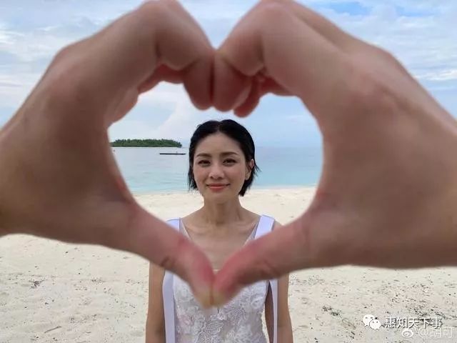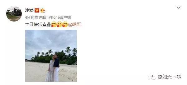 照片中的二人相拥着站在沙滩上,沙溢身穿衬衣和白色西装裤,胡可则是白色礼服纱裙,在背景的衬托下,两个人脸上都带着微微的笑意,看起来真是有如神仙眷侣一般。