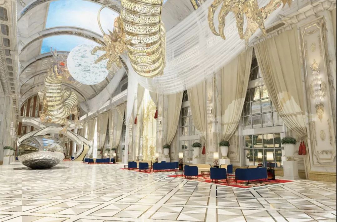 开幕当天,酒店大堂悬挂两条施华洛世奇水晶镶嵌的巨龙。有媒体报道称,这对挂件是吴佩慈送给“婆婆”的开业贺礼,宝石是其聘请欧洲珠宝工匠手工打造,折合人民币花费约10亿元。公开资料中崔女士是一位珠宝收藏家,吴小姐送上的这份大礼足够隆重。