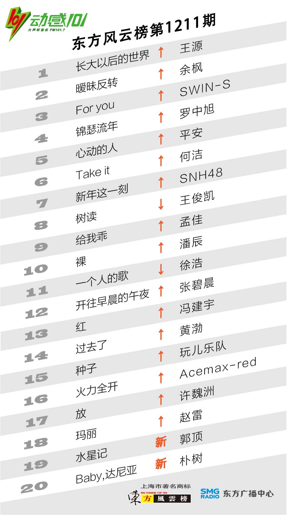 (BY DJ 罗毅)1211期《东方风云榜》TFBOYS王源的《长大以后的世界》是衷心表达的励志之作,获得歌迷认可,摘得本周冠军。